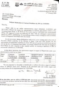 برن پور میں واقع آئی آئی ایس سی او اسٹیل پلانٹ میں ٹھیکہ مزدوروں کی تعداد کم کرنے کے فیصلے نے مزدوروں اور مقامی قیادت کے درمیان تشویش پیدا کر دی ہے۔ اسٹیل اتھارٹی آف انڈیا لمیٹڈ (سیل) کے ڈائریکٹر (کارمک) کے۔ کے۔ سنگھ کی جانب سے جاری کردہ ایک خط میں ہدایت دی گئی ہے کہ 31 مارچ 2026 تک ٹھیکہ مزدوروں کی تعداد میں کم از کم 20 فیصد کمی لائی جائے۔