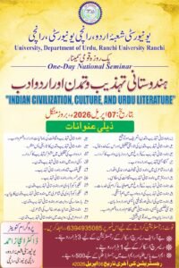 رانچی: رانچی یونیورسٹی کے شعبۂ اردو میں 7 اپریل 2026 کو “ہندوستانی تہذیب، ثقافت اور اردو ادب” کے موضوع پر ایک روزہ قومی سمینار منعقد ہونے جا رہا ہے۔ یہ سمینار نئی تعلیمی پالیسی 2020 کے تناظر میں منعقد کیا جا رہا ہے، جس کی وجہ سے اس کی علمی،تہذیبی اور تعلیمی اہمیت مزید بڑھ جاتی ہے۔