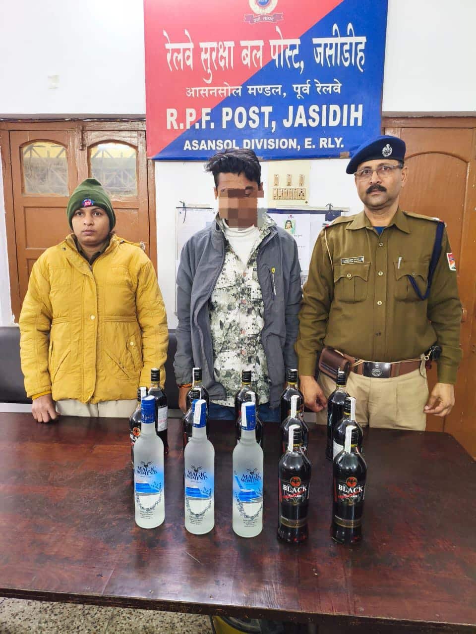 26 दिसंबर 2025 को जसीडीह स्टेशन पर नियमित बैगेज स्कैनर जांच के दौरान शाम के समय दो यात्री बैगों में संदिग्ध सामग्री पाए जाने पर सतर्क आरपीएफ कर्मियों ने तत्काल कार्रवाई करते हुए सामान को जांच के लिए रोका। गहन जांच के दौरान कुल 15 बोतल शराब बरामद की गई, जिनमें 12 बोतल ब्लैक बैकार्डी तथा 3 बोतल मैजिक मोमेंट्स ग्रेन वोडका शामिल हैं। सभी बोतलें 750 मिलीलीटर क्षमता की थीं।