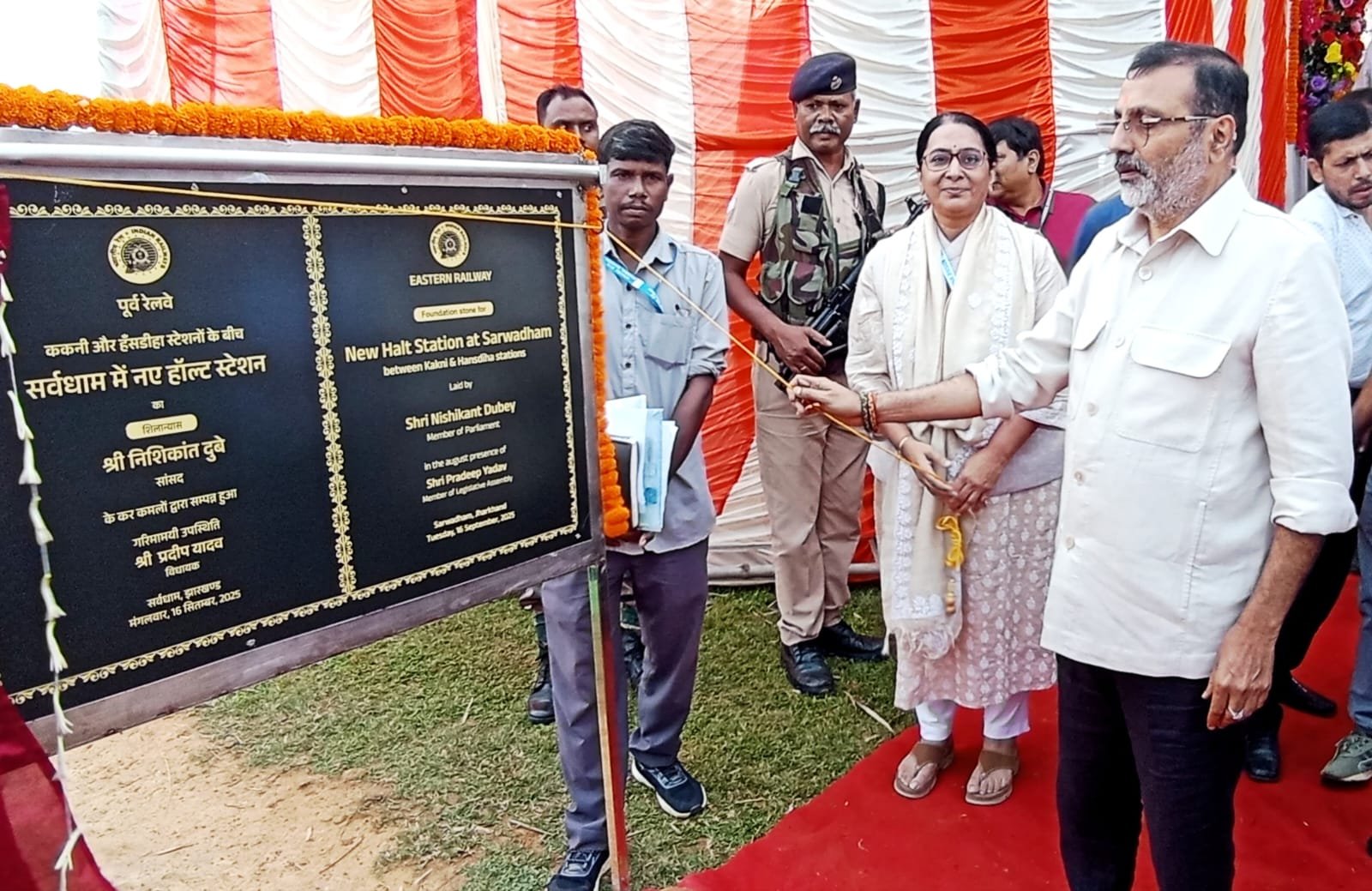 क्षेत्रीय रेल अवसंरचना और यात्री सुविधाओं में सुधार की दिशा में एक महत्त्वपूर्ण मील का पत्थर साबित होते हुए, पूर्व रेलवे के आसनसोल मंडल के अंतर्गत मोहनपुर-हंसडीहा सेक्शन के ककनी और हंसडीहा स्टेशनों के बीच स्थित सर्वधाम में नए हॉल्ट स्टेशन की आधारशिला आज (16.09.2025) *माननीय सांसद, श्री निशिकांत दुबे* द्वारा *श्रीमती विनीता श्रीवास्तव, मंडल रेल प्रबंधक, आसनसोल* और अन्य वरिष्ठ रेलवे अधिकारियों की गरिमामयी उपस्थिति में रखी गई।