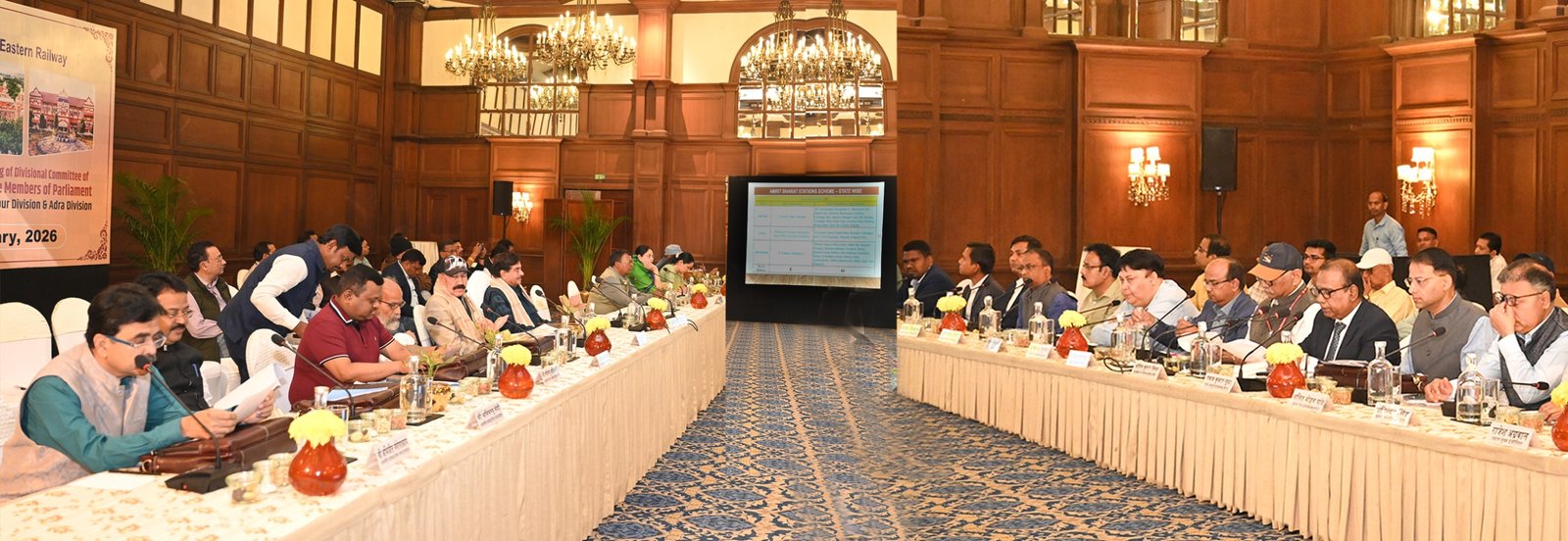 दक्षिण पूर्व रेलवे के खड़गपुर एवं आद्रा मंडल की मंडलीय समिति के माननीय सांसद 18 फरवरी, 2026 को कोलकाता में दक्षिण पूर्व रेलवे के महाप्रबंधक श्री अनिल कुमार मिश्रा के साथ बैठक करते हुए।