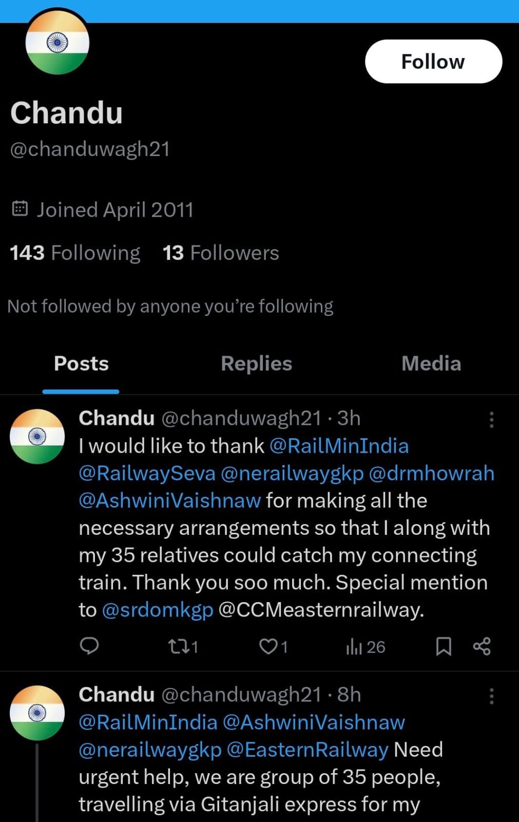 मुंबई से गुवाहाटी जा रहे बारात पार्टी को हावड़ा के पास एक अजीब संकट का सामना करना पड़ा। जब वह हावड़ा से लगभग 15 किलोमीटर की दूरी पर थे तो बारात पार्टी के प्रमुख को एहसास हुआ कि बारात दल में बहुत सारे बुजुर्ग और बच्चे भी हैं जो जल्दी-जल्दी में एक प्लेटफार्म से दूसरे प्लेटफार्म पर जाकर दूसरी ट्रेन पकड़ पाने में सक्षम नहीं है। ऐसे में बारात दल की प्रमुख चंद्रशेखर बाघ ने ट्विटर के माध्यम से मंडल रेल प्रबंधक हावड़ा और सीनियर डीसीएम हावड़ा से मदद की अपील की। दोनों अधिकारियों ने हावड़ा स्टेशन पर अपने मातहत कर्मचारियों को आवश्यक सहायता देने का निर्देश दिया। फिर क्या था। जैसे ही गीतांजलि एक्सप्रेस हावड़ा स्टेशन पर पहुंची तो रेलवे के कर्मचारियों एवं अधिकारियों ने मिलकर एक विशेष कॉरिडोर बनाया और बारात दल के सभी 35 लोगों को कम समय में प्लेटफार्म संख्या 21 न्यू परिसर से प्लेटफार्म संख्या 9 ओल्ड कंपलेक्स तक पहुंचाने में मदद दी। बारात दल के बुजुर्ग सदस्यों के लिए चार बैटरी ऑपरेटेड कार्ट और व्हीलचेयर की भी व्यवस्था की गई। एक दर्जन से अधिक रेलवे कर्मचारी बारात दल की सहायता में जुटे रहे। रेलवे स्टेशन पर की गई विशेष व्यवस्था के चलते बारात दल के सभी सदस्य 12345 सारीघाट एक्सप्रेस को पकड़ने में सफल रहे और निर्धारित समय पर दुल्हन के घर पहुंच गए। इसके बाद बारात दल के प्रमुख चंद्रशेखर बाग ने ट्विटर पर रेल मंत्री, रेलवे के अधिकारियों और कर्मचारियों को धन्यवाद दिया।