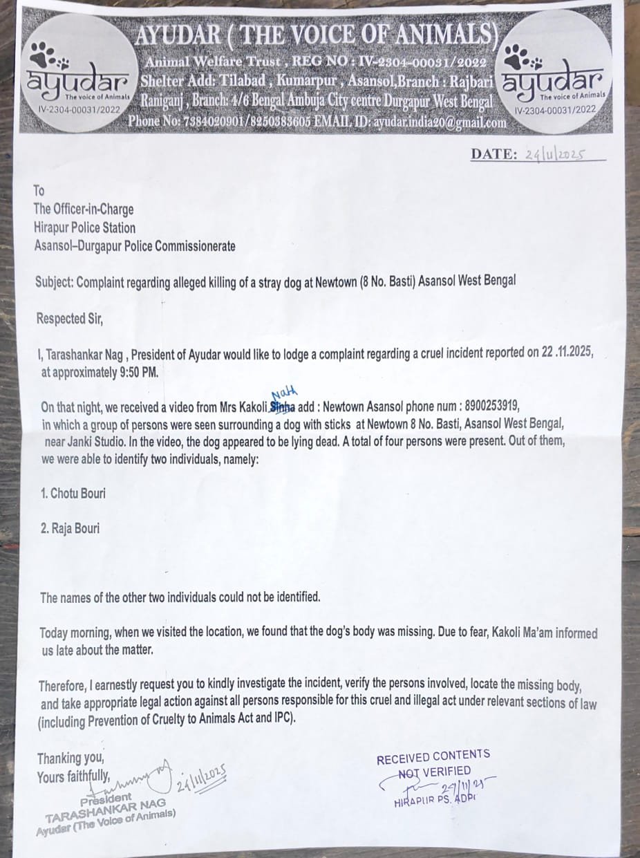 *बर्णपुर* , पश्चिम बंगाल आसनसोल हीरापुर थाना अंतर्गत बर्णपुर न्यू टाउन आठ नंबर बस्ती इलाके मे शनिवार रात 9 बजकर 50 मिनट पर इलाके के ही रहने वाले दो युवक छोटू बाउरी और राजा बाउरी ने एक आवारा कुत्ते को लाठी और डंडे से पिट -पिटकर मौत के घाट उतार डाला, वहीं घटना की खबर सुन मौके पर पशु प्रेमी काकोली नाथ पहुंच गई और दोनो हत्यारे युवकों को रंगे हाँथ पकड़ लिया और दोनो का अपने मोबाइल कैमरे से विडिओ बनाने लगी, इसके अलावा उन्होंने दोनो युवकों से यह सवाल भी किया की कुत्ते ने उनका क्या बिगाड़ा था की उन्होंने उसकी इतनी बेरहमी से पिटाई कर जान ले ली, जिस सवालों का एक भी जवाब हत्यारे युवकों के पास नही था और वह अपना मुह छुपाते हुए भागने लगे, जिस विडिओ को काकोली नाथ ने आसनसोल लवर्स नाम के एक सोसल अकाउंट के जरिए पोस्ट किया है, जो पोस्ट जमकर वायरल हो रहा है, इस पोस्ट मे काकोली नाथ ने पूरी घटना की बेहद बारीकी से जानकारी दी है और आरोपियों के खिलाफ पशुओं के ऊपर काम करने वाले तमाम एनजीओ से यह अपील की है की वह इस मामले को गंभीरता से देखें की आवारा पशुओं के साथ हैवानियत भरी घटना को कोई दोबारा अंजाम ना दे सके, वहीं इस पोस्ट को देख आयुदार द वॉइस ऑफ एनिमल्स ने मामले मे हस्तक्षेप किया और हीरापुर थाने मे दोंनो आरोपी युवकों के खिलाफ लिखित शिकायत दर्ज करवाकर उनके खिलाफ कानूनी कार्रवाई की मांग की इस दौरान मौके पर आयुदार संस्था की ओर से संस्था के राष्ट्रीय अध्यक्ष तारा संकर नाग और लिपिका चक्रवर्ती, पार्थ गाँगुली, बिक्रम, अनिक मुख्य रूप से उपस्थित थे जिन्होंने घटना की खूब निंदा भी की