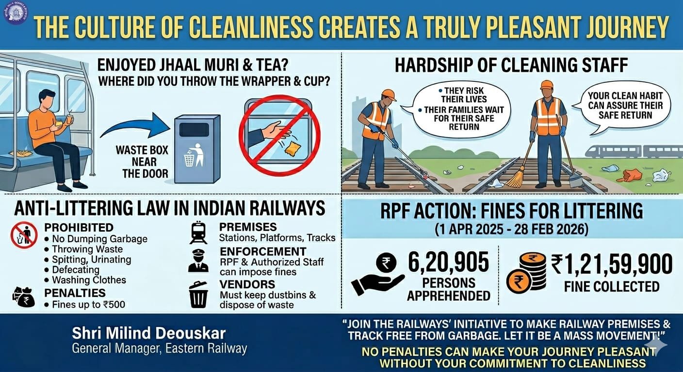 वर्तमान वित्तीय वर्ष (1 अप्रैल 2025 से 28 फरवरी 2026) के दौरान पूर्व रेलवे के आरपीएफ ने रेलवे परिसर में कचरा फैलाने के लिए 6,20,905 लोगों को पकड़ा और ₹1,21,59,900 का जुर्माना वसूला।