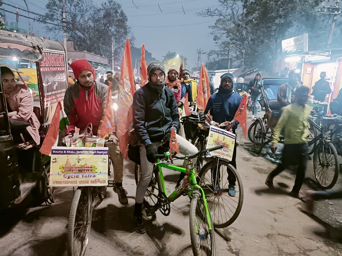 सीतारामपुर- 22 जनवरी को अयोध्या में श्री राम लाल की मंदिर का प्राण प्रतिष्ठा कार्यक्रम में पूरा देश जहां एक और हर्ष उल्लास मनाया जा रहा है। वहीं मंदिरों की सफाई हो रही है जगह-जगह पर भगवा ध्वज लहराया जा रहा है वहीं पांच लोगों की एक दल पाच साइकिल से पश्चिम बंगाल के उल्बेरिया से राम मंदिर के दर्शन करने को जा रहे हैं। नियामतपुर में टीम के सदस्यों ने बताया कि वे लोग पश्चिम बंगाल के उलबेरिया शहर से निकले हैं जो की झारखंड बिहार के रास्ते हुए उत्तर प्रदेश भगवान श्री राम की धरती अयोध्या पहुंचेंगे वही साइकिल से जा रहे हैं कर सेवको को लोगों ने चाय मिठाई खिलाया ओर उन्हे शुभकामना देते हुए आगे की ओर विदाई दी।